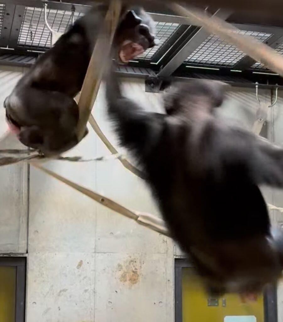 ニナとイブの大きな違いは年齢で、野生のチンパンジーは、基本的には生成熟した若いメスが他の群れへ移籍します。若いメスのほうが、受け入れられやすいのかな?でも年齢ってみわけられるのかな?いろんな事を考えます。とりあえずリズとイブは、もう少し、金網越しで様子を見ようと思います。