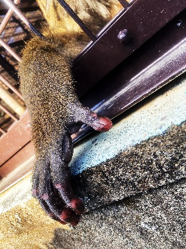そして落ち葉は寒さ対策にもなります。宮崎は南国と呼ばれますがマンドリルが暮らしている森林は年間通して平均気温が20℃を超えるような温かい場所です。日本の冬はとても寒く、落ち葉がない展示場で一度マンマルがしもやけのようになったこともありました
