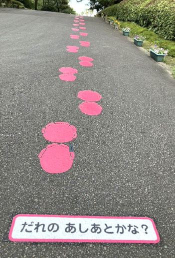 この度、動物園のゲートから園内に向かう坂道において、来園者のみなさまに少しでも楽しんで歩いていただこうと『どうぶつあしあとクイズ』が登場しました!