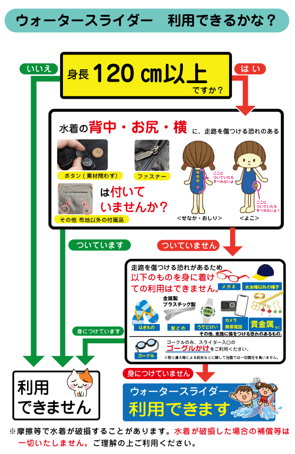 - ウォータースライダーの滑走による摩擦等で水着が破損(破れる)ことがあります。水着が破損した場合の補償等は一切いたしません。ご理解の上ご利用下さい。
